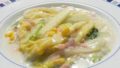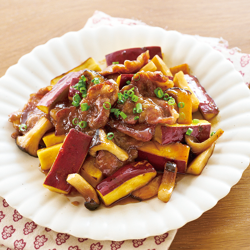 - フライパンに油を熱してエリンギを色よく焼き、端に寄せ、豚肉を炒め、続いてさつまいもを炒める。みりん、醤油、酢、砂糖を加えてとろみが付くまで炒め合わせる。器に盛り、葉ねぎをちらす。