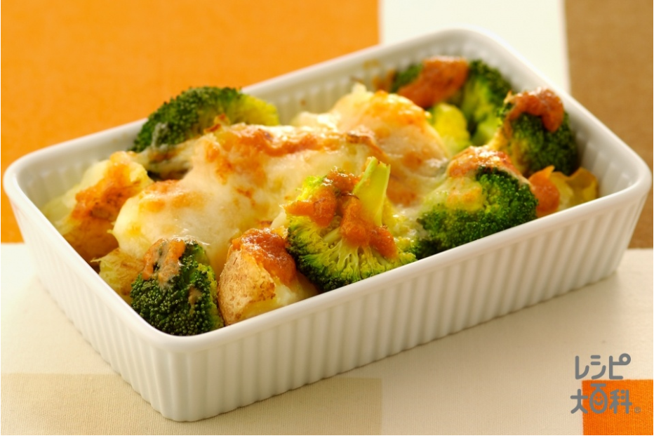 上下を返してさらに3分、やわらかくなるまで加熱し、ボウルに入れて、フォークで粗くつぶす。 - ブロッコリーは2~3等分にし、耐熱容器に入れてラップをかけ、電子レンジで1分加熱し、(1)に加えてあえる。